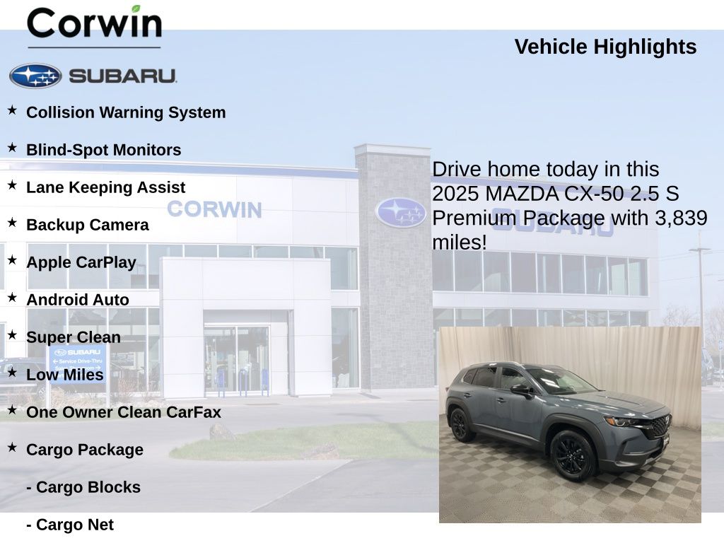 Backed by a clean CARFAX report and with only 3,839 miles on the odometer, this one-owner CX-50 is a true gem. Meticulously maintained and ready to provide years of reliable service, this SUV is an exceptional value proposition.