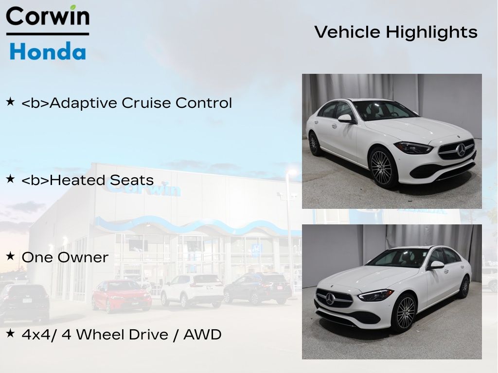 COME ON IN TO CORWIN Honda FOR YEAR END PRICING ON OVER 200 PRE-OWNED VEHICLES!! Priced below KBB Fair Purchase Price! 2024 MANUFAKTUR Moonlight White Metallic Mercedes-Benz C-Class C 300 4MATIC® CARFAX One-Owner. Clean CARFAX.