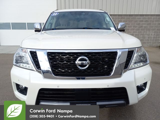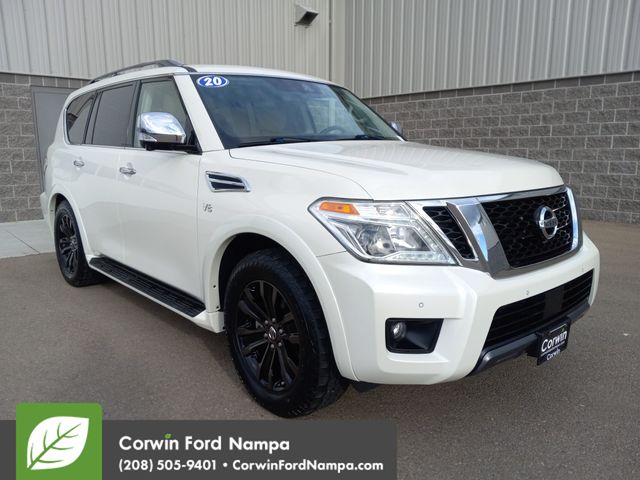 Rugged yet refined, our Low Mileage 2020 Nissan Armada Platinum 4WD lets you drive with confidence in Pearl White! Powered by a massive 5.6 Liter V8 generating 390hp matched to a responsive 7 Speed Automatic transmission with Tow/Haul mode to handle trailers with ease. Our Four Wheel Drive SUV can reach nearly 18mpg on the highway, and it takes a commanding stance with LED lighting, fog lamps, power heated mirrors, a power sunroof, a power liftgate, and huge 20-inch alloy wheels.