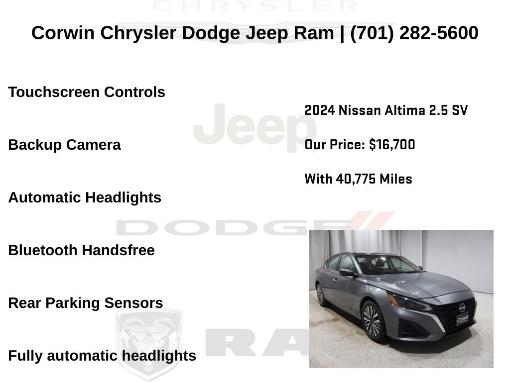 LETS MARCH INTO SPRING AT CORWIN CHRYSLER DODGE JEEP RAM OF FARGO!! WE HAVE SAVINGS ON ALL OF OUR PRE-OWNED VEHICLES AVAILABLE!! WE HAVE ONE OF THE LARGEST SELECTIONS OF INVENTORIES IN OUR AREA AT ONE SINGLE LOCATION!! Priced below KBB Fair Purchase Price! Gun Metallic 2024 Nissan Altima 2.5 SV 4D Sedan FWD 2.5L 4-Cylinder DOHC 16V CARFAX One-Owner.
