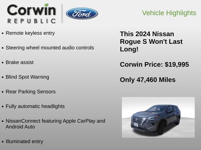 The 2024 Nissan Rogue S is the perfect blend of versatility, technology, and safety, making it the ideal choice for your next adventure. With its sleek exterior design and well-appointed interior, this SUV is ready to elevate your driving experience.