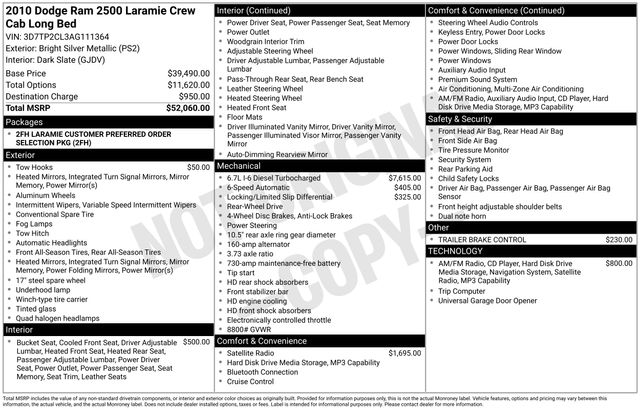 2010 Ram 2500 Laramie RWD Cummins 6.7L I6 Turbodiesel Bright Silver Metallic Clearcoat