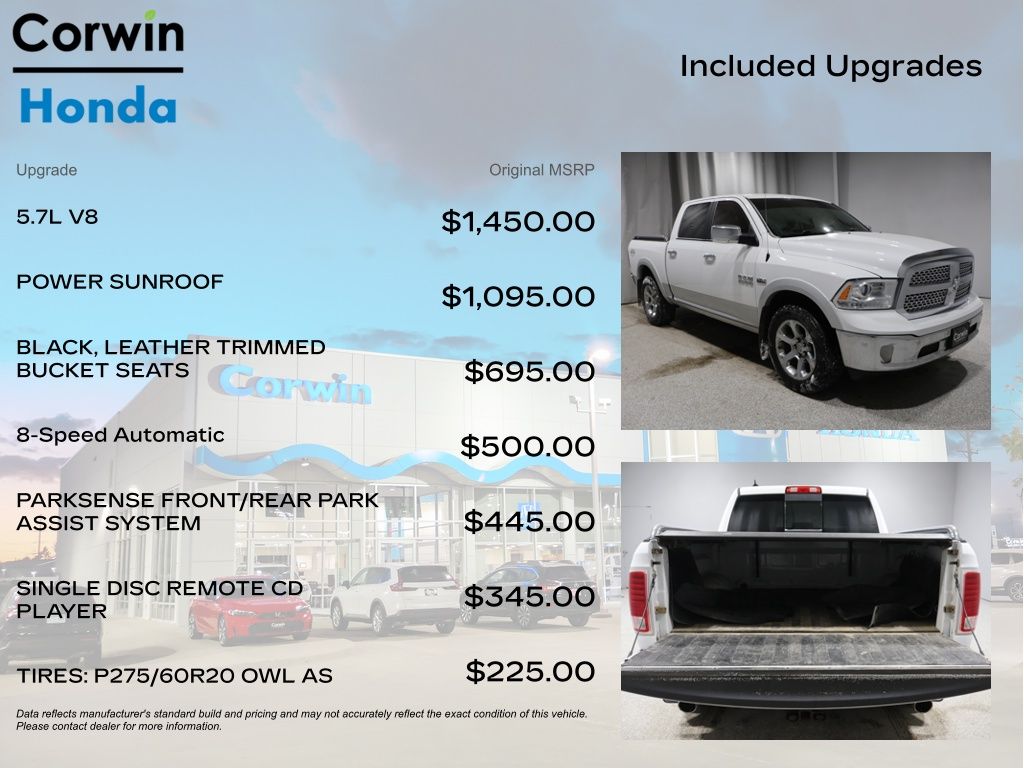 This Ram 1500 is well equipped with these key features and benefits, *Heated and Cooled Seats, Moonroof, 4x4/ 4 Wheel Drive / AWD, Local Trade, Heated Rear Seats, Quick Order Package 26H Laramie.