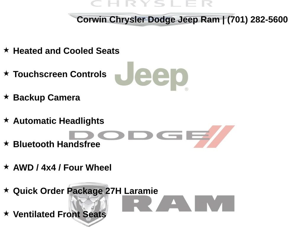 This Ram 1500 is well equipped and includes these key features and benefits, Heated and Cooled Seats, Touchscreen Controls, Backup Camera, Automatic Headlights, Bluetooth Handsfree, AWD / 4x4 / Four Wheel, Heated Front Seats, Quick Order Package 27H Laramie, Ventilated Front Seats.