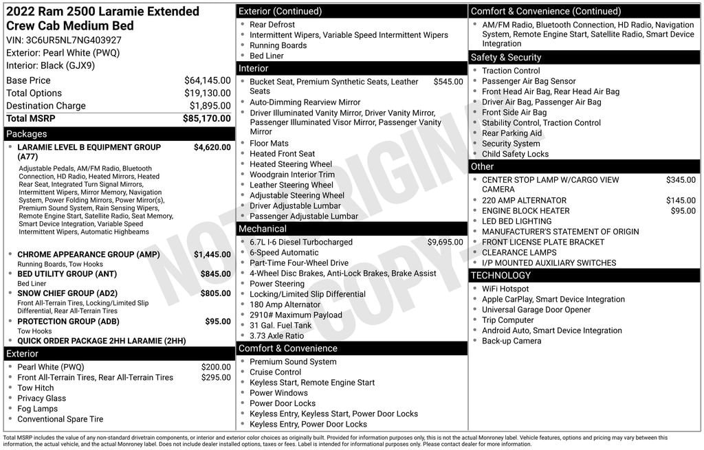 This 2022 Ram 2500 Laramie is a true workhorse, built to handle the demands of your lifestyle with ease. Whether you're towing heavy loads, traversing rugged terrain, or simply enjoying the open road, this truck is ready to rise to the challenge. Experience the power, comfort, and sophistication that only a Ram 2500 Laramie can provide. Visit our showroom today and let us demonstrate how this exceptional vehicle can transform your driving experience.