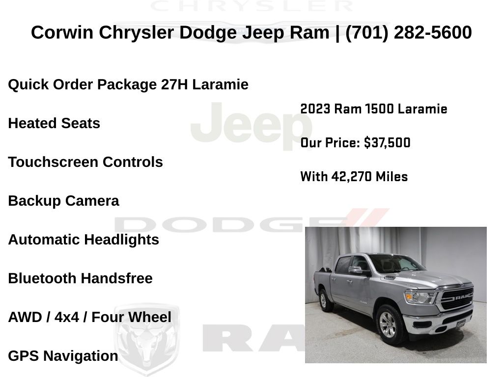 HAPPY HOLIDAYS FROM CORWIN CHRYSLER DODGE JEEP RAM OF FARGO!! WE HAVE STOCKINGS FULL OF SAVINGS ON ALL OF OUR PRE-OWNED VEHICLES AVAILABLE!! WE HAVE ONE OF THE LARGEST SELECTION OF INVENTORIES IN OUR AREA AT ONE SINGLE LOCATION!! Priced below KBB Fair Purchase Price! Billet Silver Metallic Clearcoat 2023 Ram 1500 Laramie FACTORY CERTIFIED 4D Crew Cab 4WD HEMI 5.7L V8 Multi Displacement VVT eTorque Certified. CARFAX One-Owner.