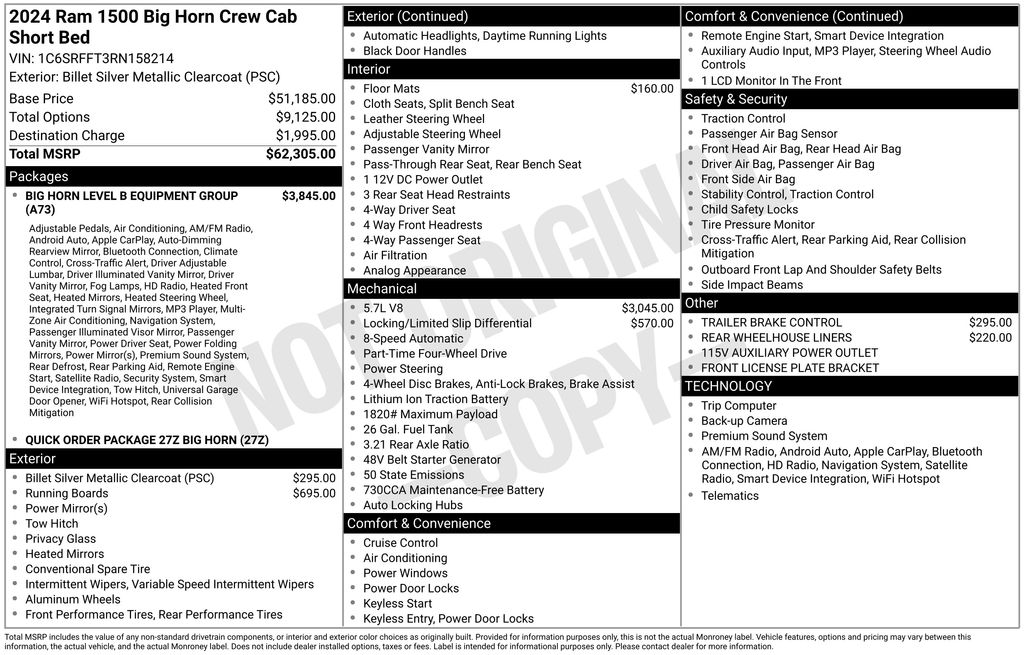 This Ram 1500 is well equipped and includes these key features and benefits, Heated Seats, Navigation System, Touchscreen Controls, Backup Camera, Automatic Headlights, Bluetooth Handsfree, AWD / 4x4 / Four Wheel, 115V Auxiliary Power Outlet, 2nd Row In Floor Storage Bins, 400W Inverter, 9 Amplified Speakers w/Subwoofer, Air Conditioning ATC w/Dual Zone Control, Auto-Dimming Exterior Driver Mirror, Auto-Dimming Rear-View Mirror, Big Horn Badge, Big Horn Level B Equipment Group, Black Premium Power Mirrors, Class IV Receiver Hitch, Cluster 7.0" TFT Color Display, Convex Wide-Angle Exterior Mirror Insert, Exterior Mirrors Courtesy Lamps, Exterior Mirrors w/Heating Element, Exterior Mirrors w/Supplemental Signals, Front Fog Lamps, Glove Box Lamp, GPS Navigation, Heated Front Seats, Heated Steering Wheel, LED Footwell Lighting, Media Hub w/2 Charge Only USBs, ParkSense Front/Rear Park Assist w/Stop, Power 2-Way Driver Lumbar Adjust, Power 8-Way Driver Seat, Power Adjustable Pedals, Power-Folding Mirrors, Quick Order Package 27Z Big Horn, Radio: Uconnect 5 Nav w/12.0" Display, Rear Dome w/On/Off Switch Lamp, Rear Power Sliding Window, Rear Window Defroster, Remote Start System, Security Alarm, SiriusXM Satellite Radio, Sun Visors w/Illuminated Vanity Mirrors, Universal Garage Door Opener.