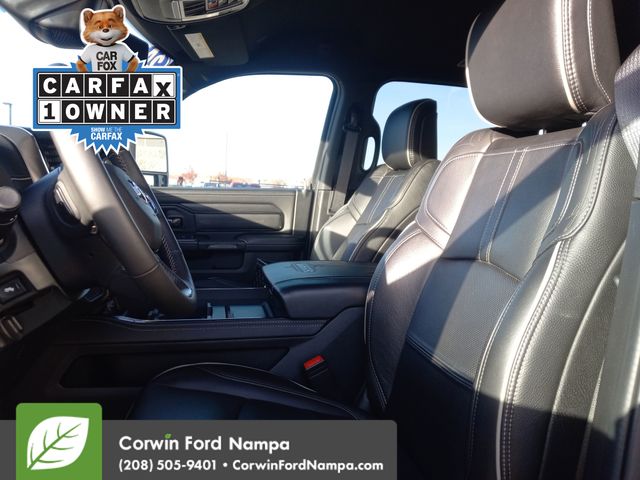 Our Diesel driven Accident Free, One Owner 2024 RAM 3500 Limited Crew Cab 4X4 delivers luxurious capability that owners love in Diamond Black Crystal Pearl! Powered by a TurboCharged 6.7 Liter Cummins Diesel 6 Cylinder generating 370hp and 850lb-ft of torque for a 6 Speed Aisin Automatic transmission. Muscular and made for hard work, this Four Wheel Drive truck welcomes sure-footed traction and responsive handling with an anti-spin rear differential and HD suspension. Our RAM is designed to dominate with an exclusive Limited grille, chrome accents, LED lighting, a tonneau cover, fog lamps, multifunction trailer mirrors, and bold alloy wheels.