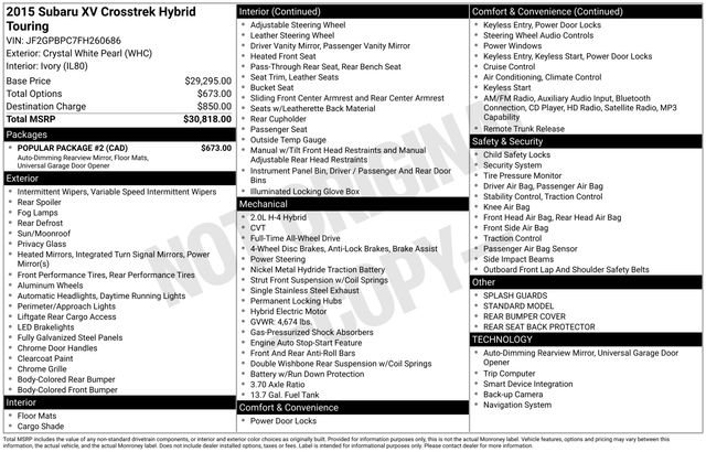 2015 Subaru XV Crosstrek Touring AWD 2.0L 16V DOHC Crystal White Pearl