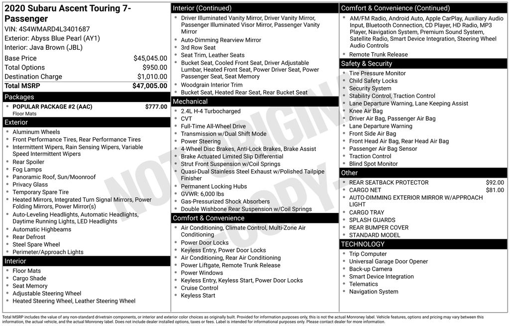 EMBRACE THE SHORTEST MONTH OF THE YEAR WITH CORWIN CHRYSLER DODGE JEEP RAM OF FARGO! WE HAVE SAVINGS ON ALL OF OUR PRE-OWNED VEHICLES AVAILABLE!! WE HAVE ONE OF THE LARGEST SELECTIONS OF INVENTORIES IN OUR AREA AT ONE SINGLE LOCATION!! Recent Arrival! Abyss Blue Pearl 2020 Subaru Ascent Touring 4D Sport Utility AWD 2.4L DOHC CARFAX One-Owner.