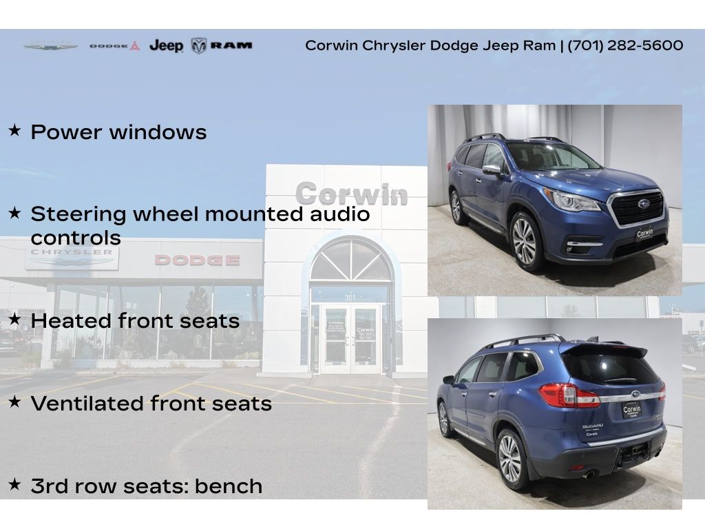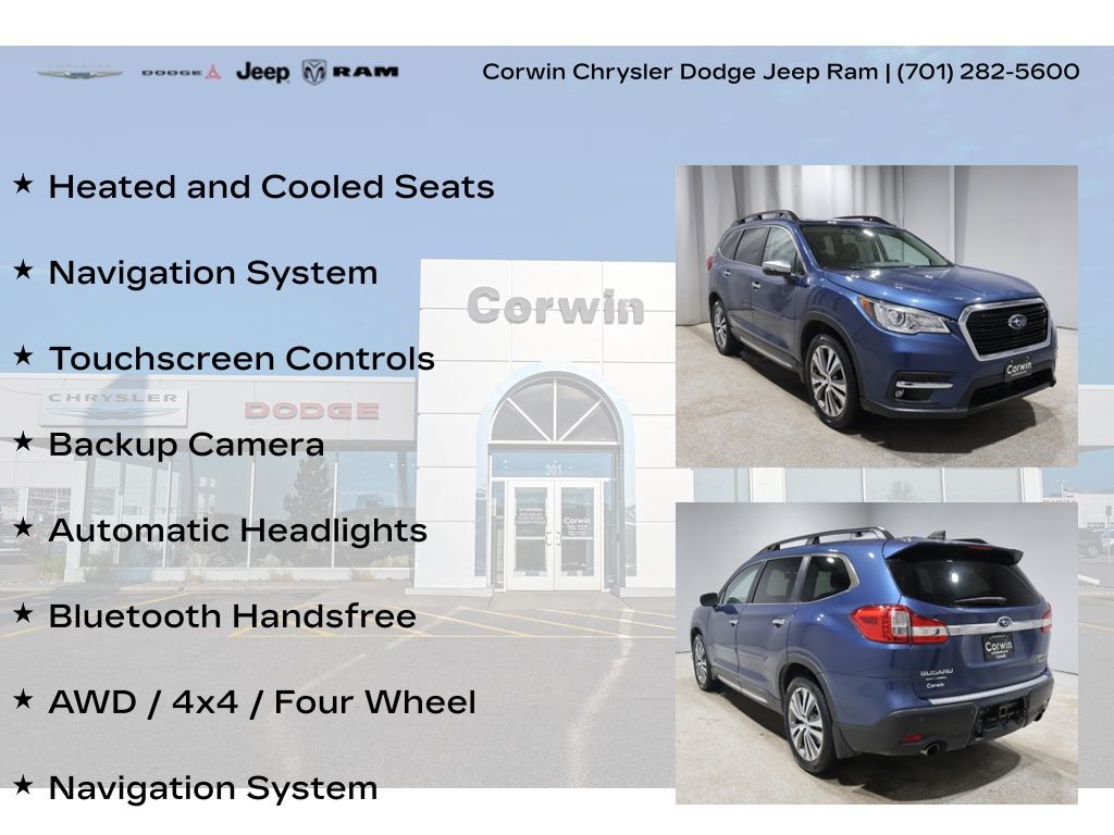This Subaru Ascent is well equipped and includes these key features and benefits, Heated and Cooled Seats, Navigation System, Touchscreen Controls, Backup Camera, Automatic Headlights, Bluetooth Handsfree, AWD / 4x4 / Four Wheel, 3rd row seats: bench, Heated front seats, Navigation System, Power windows, Steering wheel mounted audio controls, Ventilated front seats. Odometer is 2831 miles below market average! 20/26 City/Highway MPG