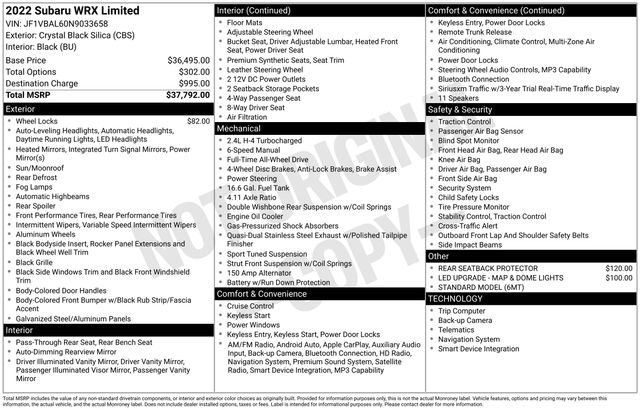 Elevate your driving experience with this stunning 2022 Subaru WRX Limited. Boasting a sleek black exterior, this high-performance sedan is ready to take on the open road with its powerful 2.4L DOHC engine and 6-speed manual transmission, all-wheel-drive capability, and impressive fuel efficiency of 19 city/26 highway MPG.