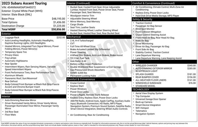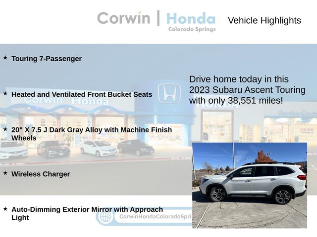 This Subaru Ascent is well equipped and includes the following features and benefits, Touring 7-Passenger, Heated and Ventilated Front Bucket Seats, 20" X 7.5 J Dark Gray Alloy with Machine Finish Wheels, Wireless Charger, Auto-Dimming Exterior Mirror with Approach Light.