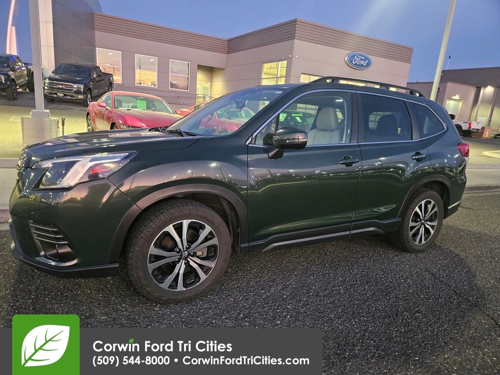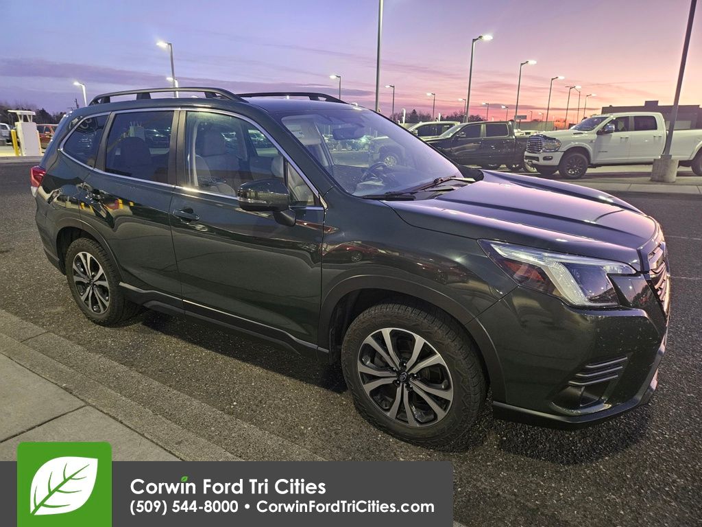 Level up to our 2023 Subaru Forester Limited AWD, and you can leave your world behind in Cascade Green Silica! Powered by a 2.5 Liter BOXER 4 Cylinder serving up 182hp to a paddle-shifted CVT that puts iconic capability at your command. This All Wheel Drive SUV also embraces adventure with dual-function X-MODE, and it scores nearly 33mpg on the highway. Premium design details elevate our Forester's style with adaptive LED headlights, fog lamps, a panoramic sunroof, a power liftgate, black alloy wheels, and raised roof rails.