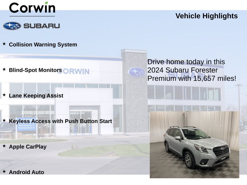 The Forester Premium's stunning Silver exterior is complemented by a wealth of premium features that elevate the driving experience. Enjoy the convenience of Keyless Access with Push Button Start, the connectivity of Apple CarPlay and Android Auto, and the peace of mind provided by the Collision Warning System, Blind-Spot Monitors, and Lane Keeping Assist.