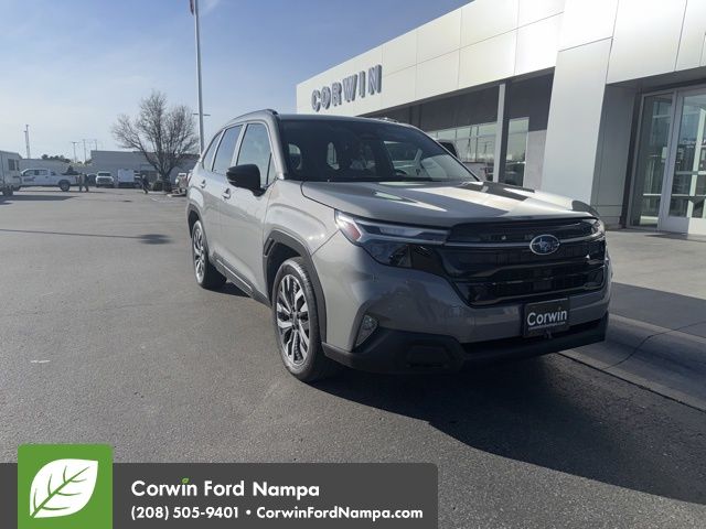 Embrace driving pleasure in our Accident Free 2025 Subaru Forester Touring AWD which offers comfort and style in River Rock Pearl! Motivated by a 2.5 Liter BOXER 4 Cylinder delivering 180hp to a paddle-shifted Lineartronic CVT. This All Wheel Drive SUV is also easy to maneuver in town, returns nearly 32mpg on the highway, and features X-MODE and active torque vectoring for trail time. Our Forester looks good as you go since it shows off a panoramic sunroof, adaptive LED lighting, fog lamps, a hands-free liftgate, low-profile roof rails, alloy wheels, and dark gray mirror caps.