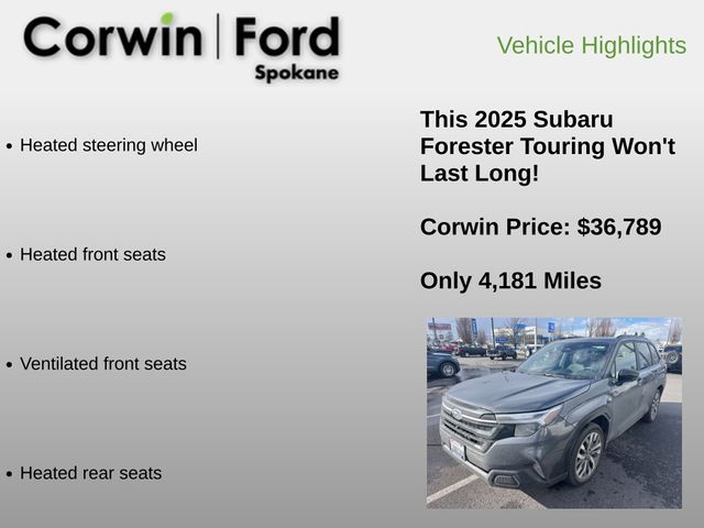 Recent Arrival! Embrace driving pleasure in our One Owner 2025 Subaru Forester Touring AWD, which offers comfort and style in Magnetite Gray Metallic! Motivated by a 2.5 Liter BOXER 4 Cylinder delivering 180hp to a paddle-shifted Lineartronic CVT. This All Wheel Drive SUV is also easy to maneuver in town, returns nearly 32mpg on the highway, and features X-MODE and active torque vectoring for trail time. Our Forester looks good as you go since it shows off a panoramic sunroof, adaptive LED lighting, fog lamps, a hands-free liftgate, low-profile roof rails, alloy wheels, and dark gray mirror caps.