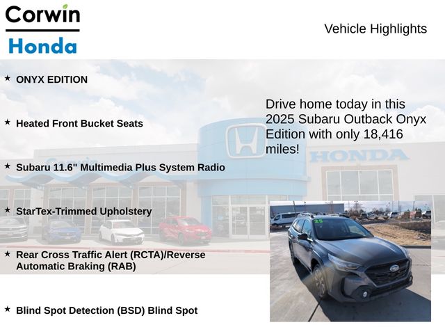 Discover the Pinnacle of Adventure and Sophistication with the 2025 Subaru Outback Onyx Edition. This exceptional vehicle seamlessly blends rugged capability, refined comfort, and cutting-edge technology, making it the perfect companion for your next journey.
