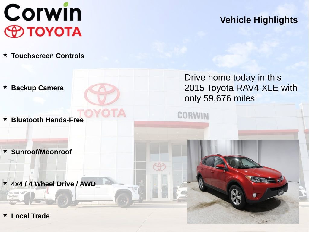 This Toyota RAV4 is well equipped and includes the following features and benefits, Touchscreen Controls, Backup Camera, Bluetooth Hands-Free, Sunroof/Moonroof, 4x4 / 4 Wheel Drive / AWD, Local Trade. Odometer is 65317 miles below market average! 22/29 City/Highway MPG