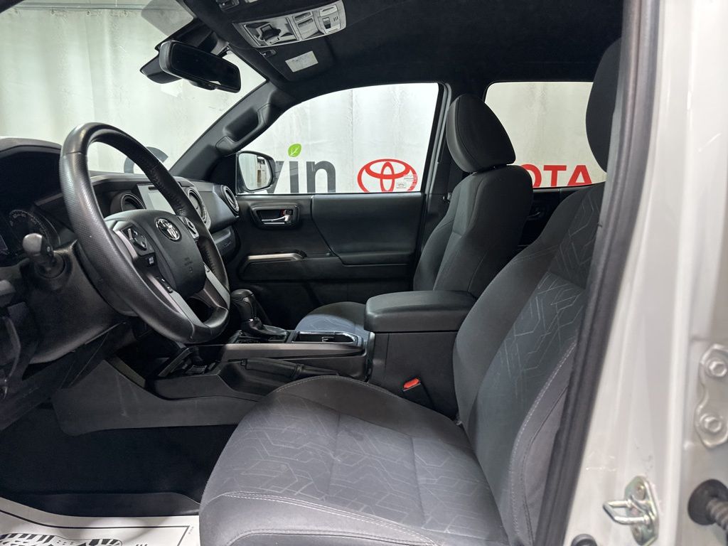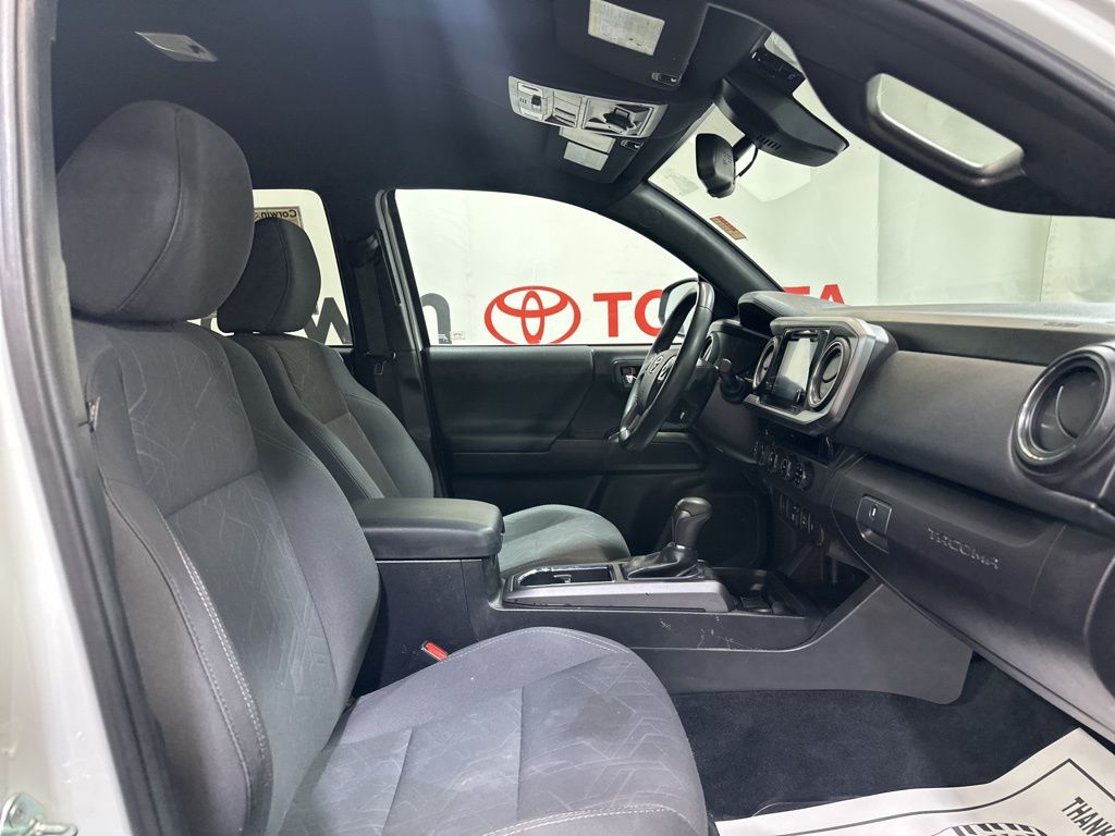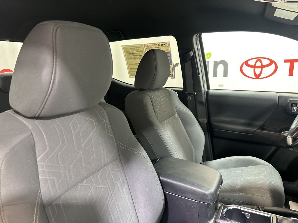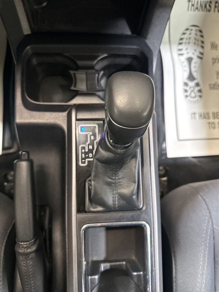Inside, the Tacoma offers a spacious and well-appointed cabin, featuring comfortable fabric seats, a leather-wrapped shift knob, and an auto-dimming rearview mirror with compass. The power sliding rear window and variable intermittent wipers add convenience and versatility to your driving experience.