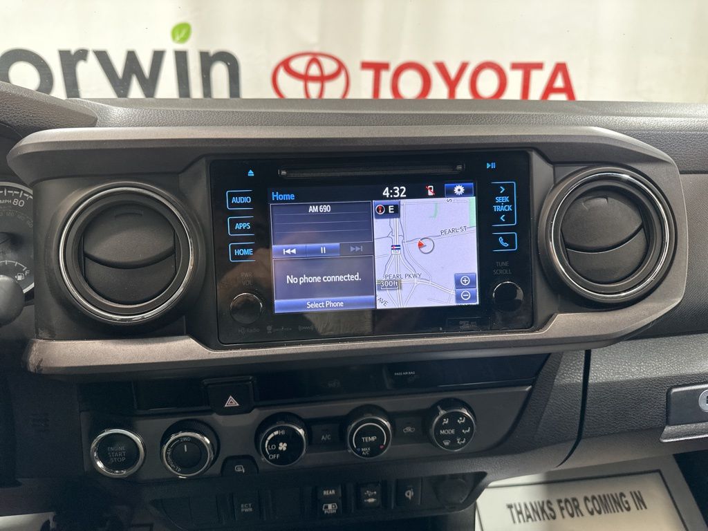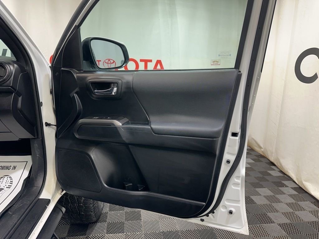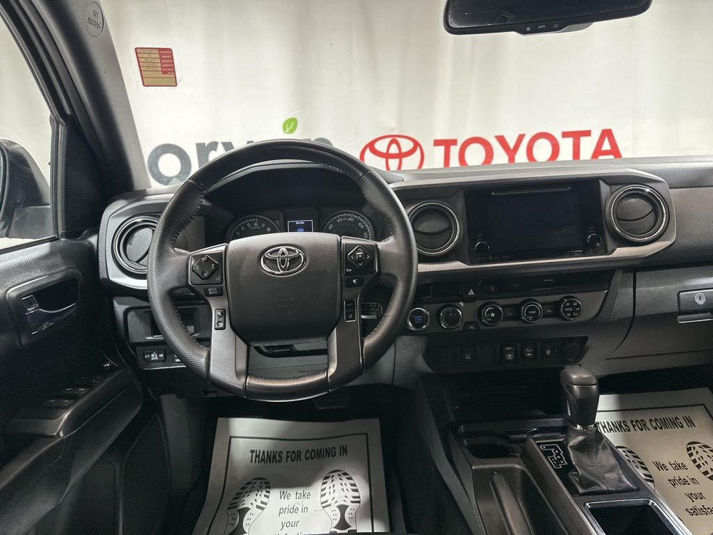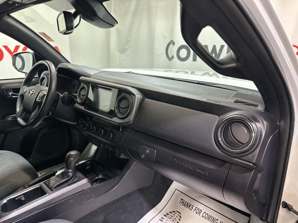 Inside, the Tacoma offers a spacious and well-appointed cabin, featuring comfortable fabric seats, a leather-wrapped shift knob, and an auto-dimming rearview mirror with compass. The power sliding rear window and variable intermittent wipers add convenience and versatility to your driving experience.