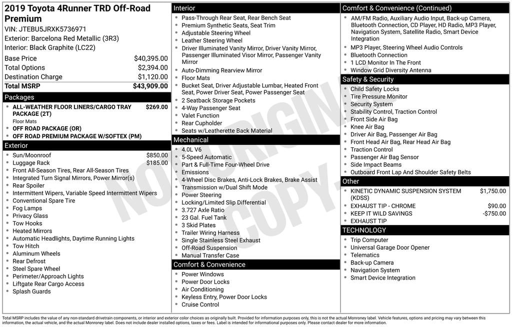 Whether you're seeking a reliable family hauler, a rugged off-road explorer, or a versatile companion for your active lifestyle, this 2019 Toyota 4Runner TRD Off-Road Premium is the perfect choice. Discover the perfect blend of capability, comfort, and convenience visit our showroom today and experience this exceptional SUV for yourself.