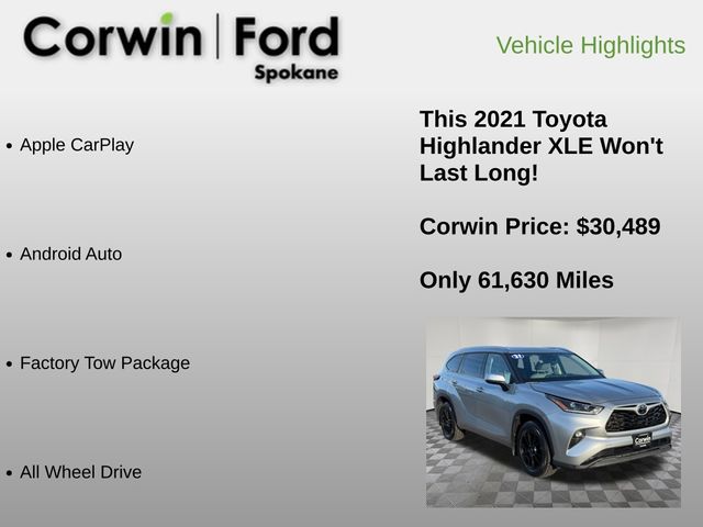 Recent Arrival! Priced below KBB Fair Purchase Price! Explore in comfort with our No Accidents Reported 2021 Toyota Highlander XLE AWD that excels at family fun in Celestial Silver Metallic! Featuring a 3.5 Liter V6 that delivers 295hp matched to an 8 Speed Automatic transmission for robust capability. This All Wheel Drive SUV is also efficient enough to return nearly 27mpg on the highway with terrain management on board, and it's stylish enough to turn heads. Check out the bold grille set off by LED lighting, fog lamps, heated power mirrors, a rear spoiler, a power liftgate, a power sunroof, and 18-inch alloy wheels.