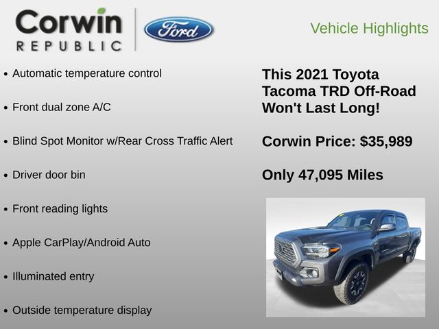 Discover the perfect blend of capability, comfort, and technology in this exceptional 2021 Toyota Tacoma V6. With its powerful 3.5L V6 engine, 4WD drivetrain, and impressive fuel efficiency, this Tacoma is ready to tackle any adventure while providing a refined and enjoyable driving experience.