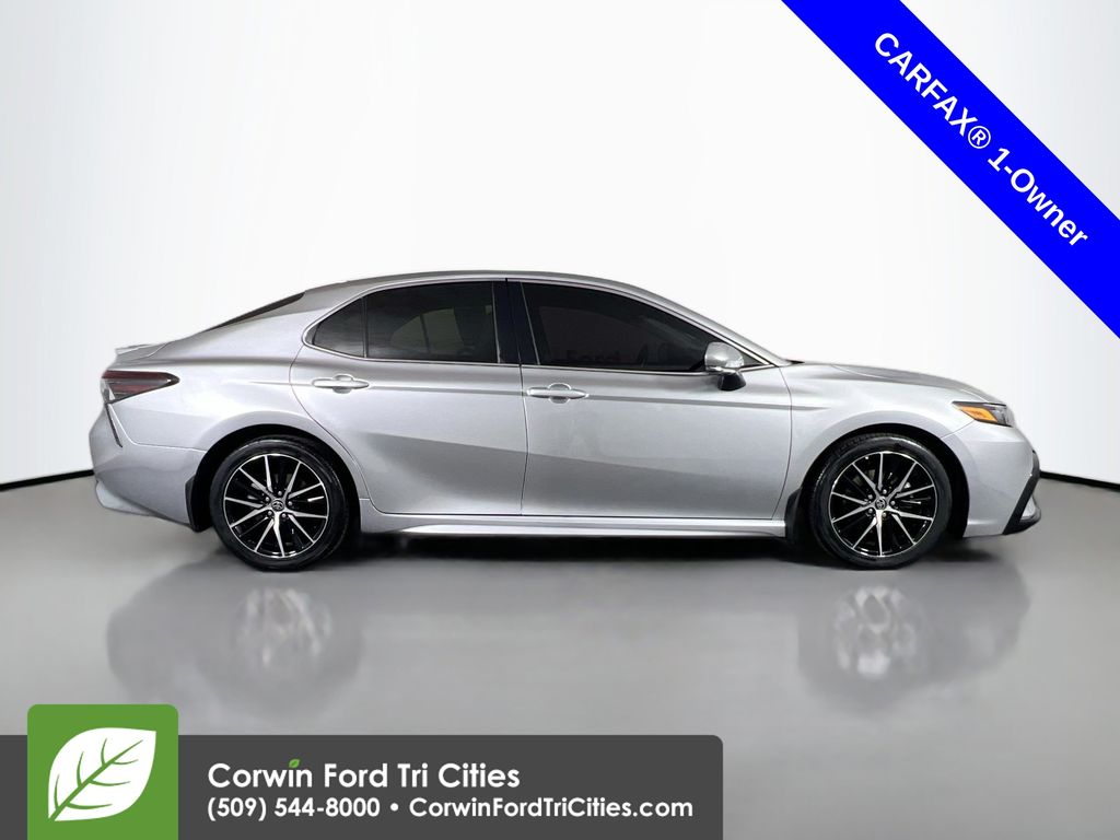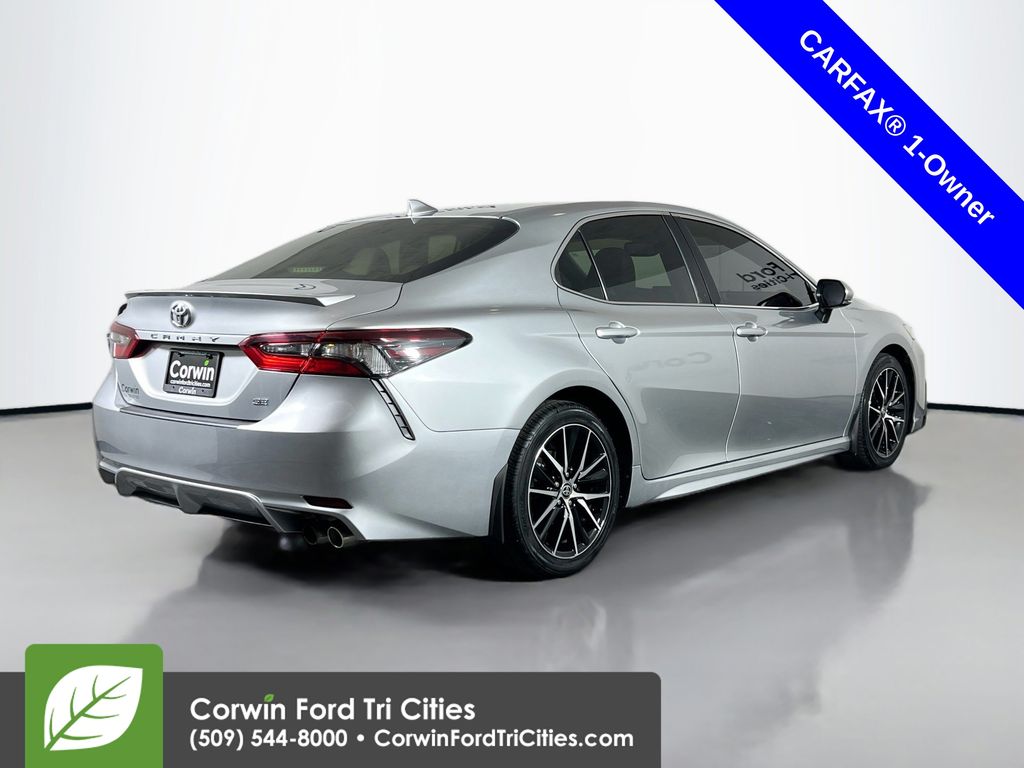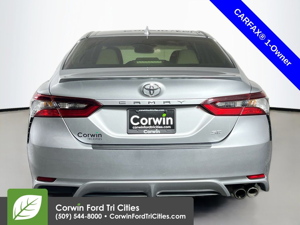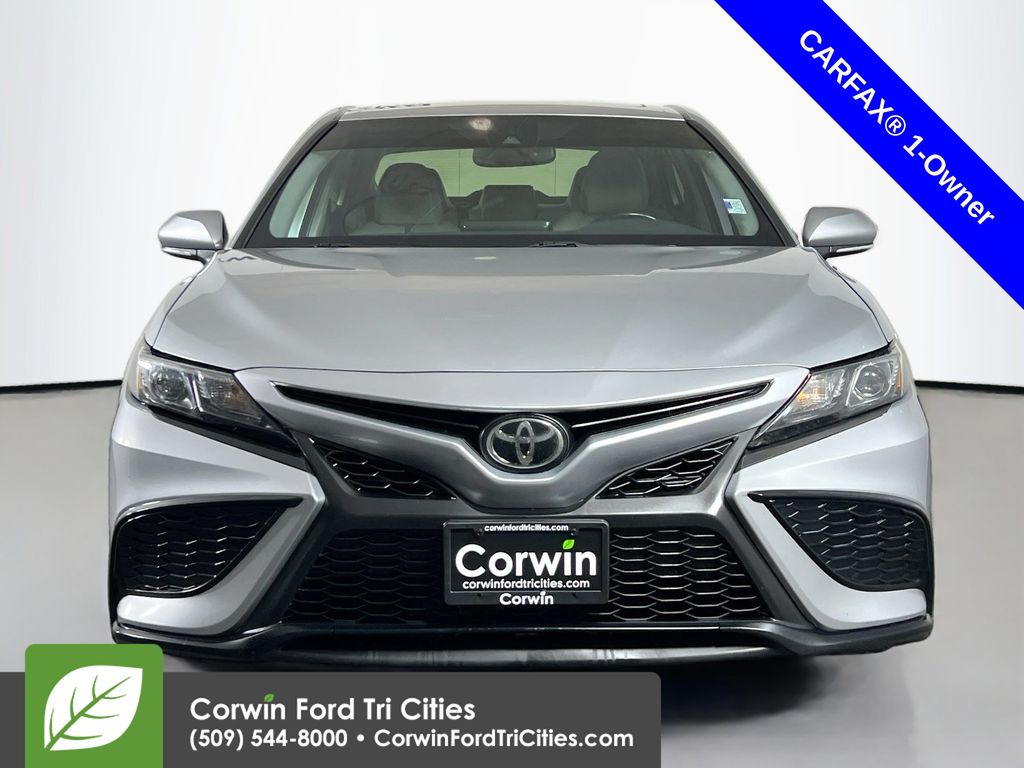 Our One Owner 2022 Toyota Camry SE Sedan is here to spice up your driving with athletic reflexes and a bold Celestial Silver Metallic design! Powered by a 2.5 Liter Dynamic Force 4 Cylinder generating 203hp paired to a paddle-shifted 8 Speed Automatic transmission. This Front Wheel Drive sedan is ready to carve the corners with its sport-tuned suspension, and it cruises at nearly 39mpg on the highway. You'll also love the aggressive design of our Camry, which shows off a black grille, prominent rocker panels, a rear spoiler, chrome-tipped exhaust outlets, LED lighting, and 18-inch black alloy wheels.