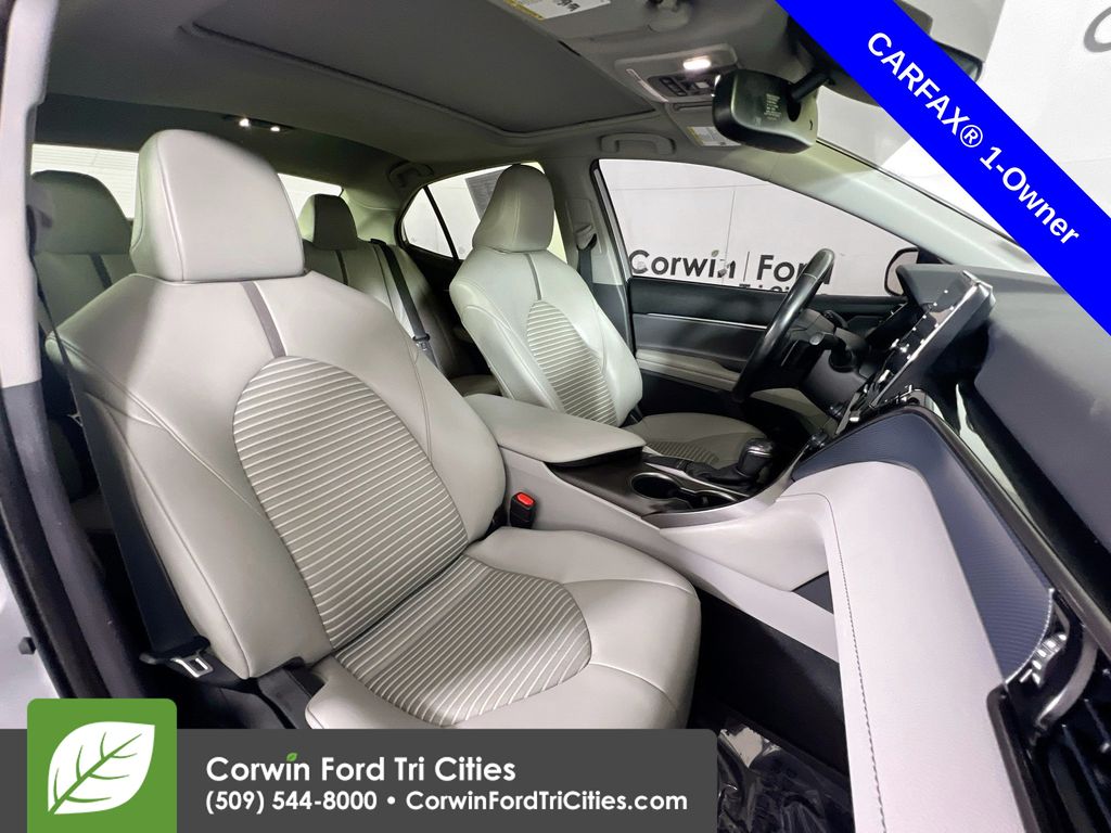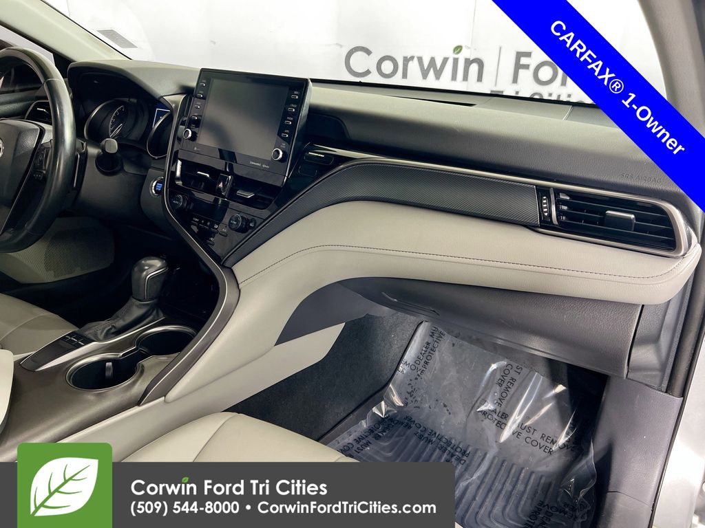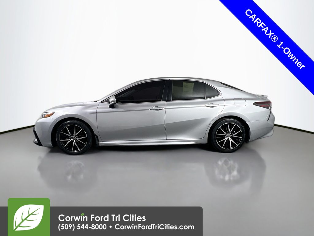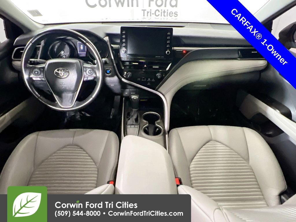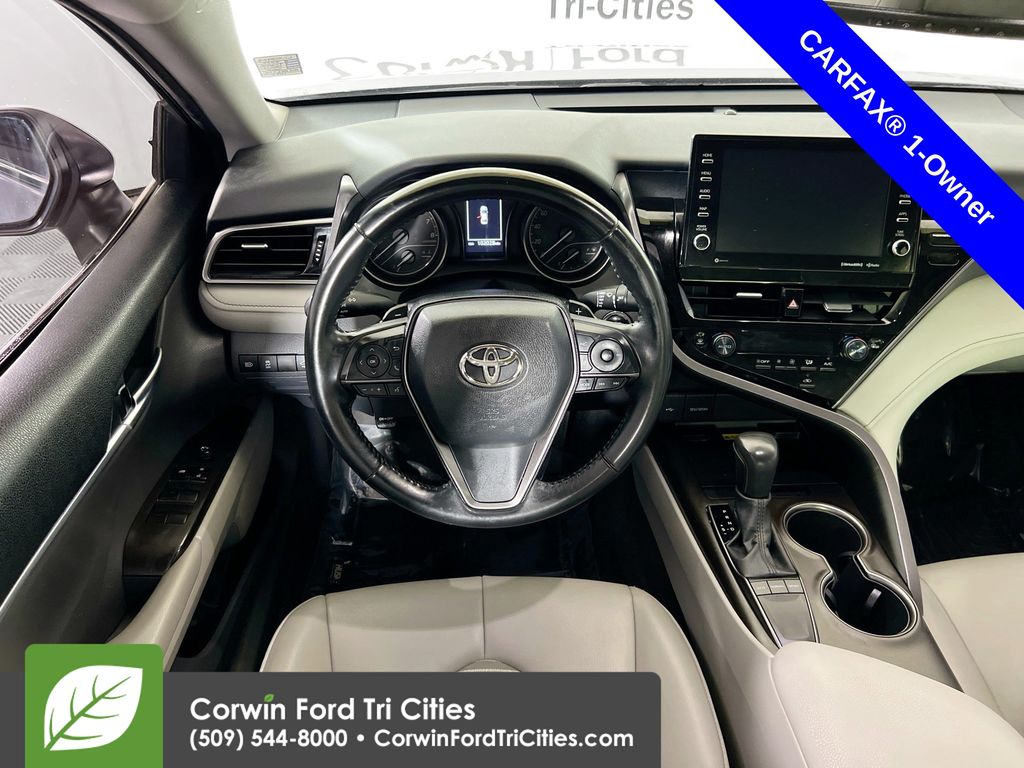 Our One Owner 2022 Toyota Camry SE Sedan is here to spice up your driving with athletic reflexes and a bold Celestial Silver Metallic design! Powered by a 2.5 Liter Dynamic Force 4 Cylinder generating 203hp paired to a paddle-shifted 8 Speed Automatic transmission. This Front Wheel Drive sedan is ready to carve the corners with its sport-tuned suspension, and it cruises at nearly 39mpg on the highway. You'll also love the aggressive design of our Camry, which shows off a black grille, prominent rocker panels, a rear spoiler, chrome-tipped exhaust outlets, LED lighting, and 18-inch black alloy wheels.