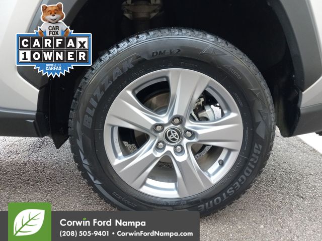 Strong and stylish, our Accident Free, One Owner with Low Mileage 2022 Toyota RAV4 XLE AWD is here to bring bold utility to your busy life in Silver Sky Metallic! Motivated by a 2.5 Liter Dynamic Force 4 Cylinder supplying 203hp tethered to an 8 Speed Direct Shift Automatic transmission for precision gear changes. This All Wheel Drive SUV makes tough challenges feel easy with terrain management, and it returns nearly 34mpg on the highway. Our RAV4's aggressive grille tells people you're at the wheel of a serious SUV with LED lighting, chrome exhaust outlets, alloy wheels, roof rails, heated power mirrors, and a rear spoiler.