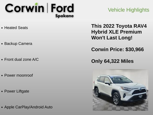 Whether navigating the daily commute or embarking on weekend adventures, the 2022 Toyota RAV4 Hybrid XLE Premium is the perfect companion. Experience the perfect balance of efficiency, capability, and sophistication. Visit our showroom today to take this remarkable SUV for a test drive and discover why it's the ideal choice for your next vehicle.
