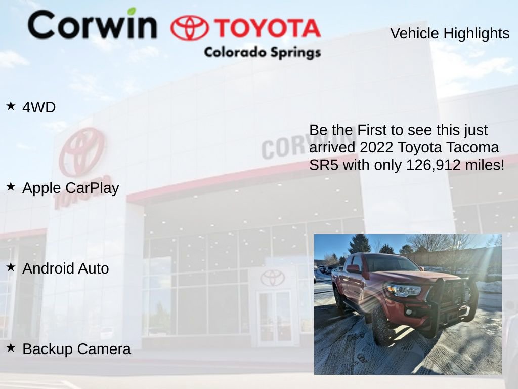 This Toyota Tacoma is well equipped and includes the following features and benefits, 4WD, Apple CarPlay, Android Auto, Backup Camera.