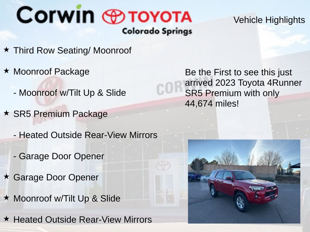 This Toyota 4Runner is well equipped and includes the following features and benefits, Third Row Seating/ Moonroof, Garage Door Opener, Heated Outside Rear-View Mirrors, Moonroof Package, Moonroof w/Tilt Up & Slide, SR5 Premium Package.