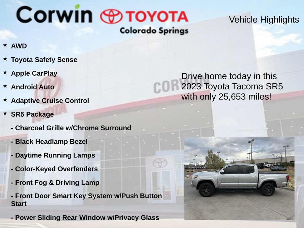 Whether you're tackling the daily commute or embarking on a weekend adventure, this 2023 Toyota Tacoma SR5 V6 is the perfect companion. Experience the perfect blend of capability, technology, and style visit our showroom today and let us demonstrate why this truck is the ideal choice for your next vehicle.
