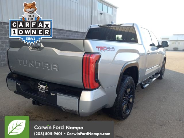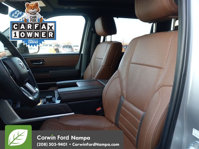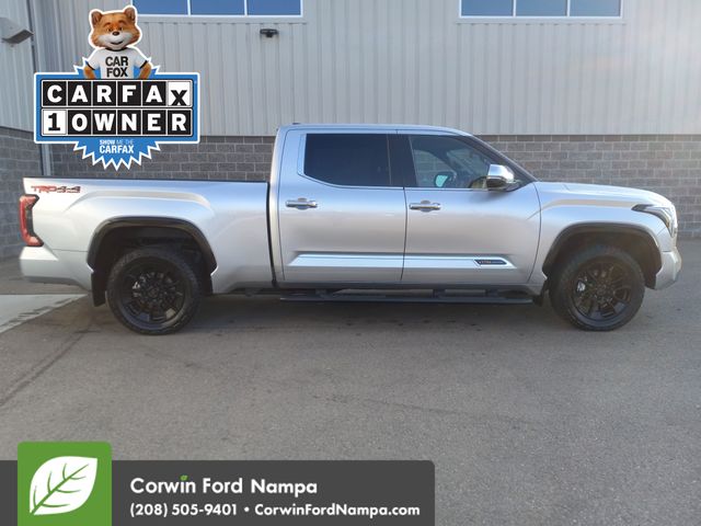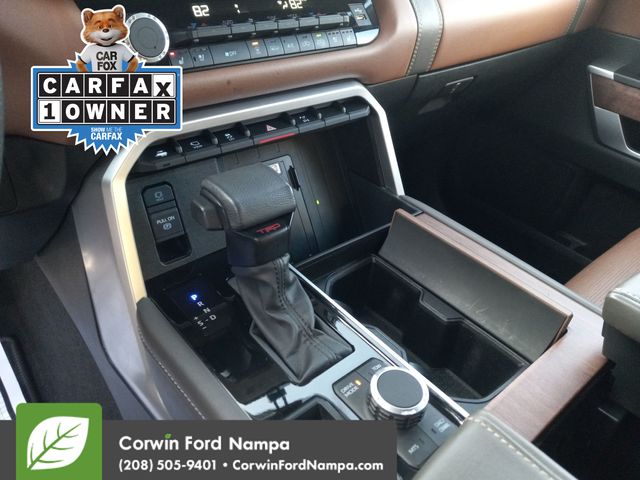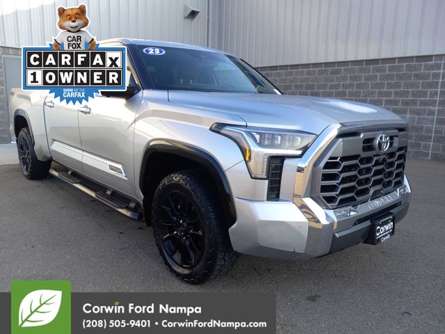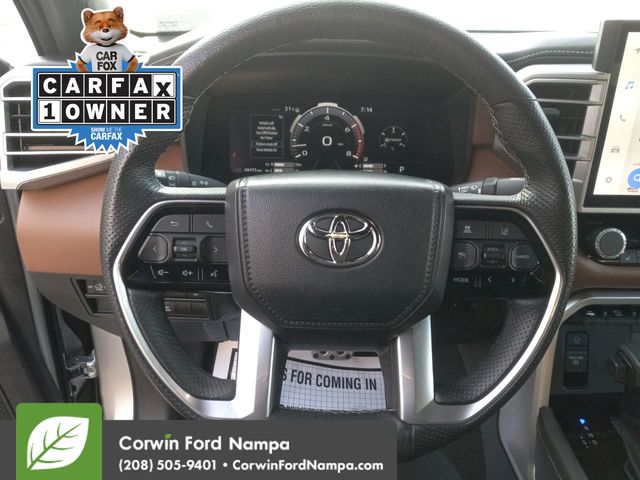 Inspired by ranching royalty, our Accident Free, One Owner 2023 Toyota Tundra 1794 Edition CrewMax 4X4 is where style and strength come together in Celestial Silver Metallic! Powered by a Twin-TurboCharged 3.4 Liter i-FORCE V6 supplying a combined 389hp for a 10 Speed Automatic transmission. This feature-rich Four Wheel Drive truck also tows, hauls, and travels with impressive road manners, and it returns nearly 22mpg on the highway. Exclusive details enhance our Tundra's good looks with chrome accents, a panoramic sunroof, premium LED lighting, fog lamps, running boards, sequential turn signals, and 20-inch alloy wheels.