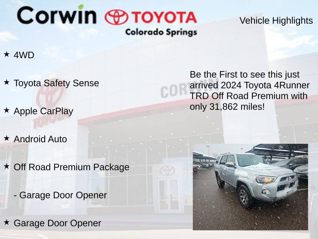 Whether you're embarking on an off-road adventure or navigating the daily commute, the 2024 Toyota 4Runner TRD Off-Road Premium is the ultimate companion. Experience the perfect blend of capability, comfort, and technology that will elevate your driving experience to new heights. Visit our showroom today and let us help you discover the perfect 4Runner for your needs.