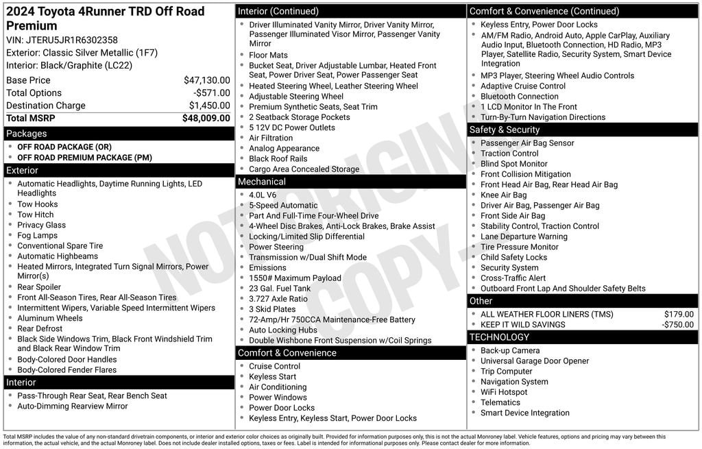 Beyond its impressive capabilities, the 2024 4Runner TRD Off-Road Premium is packed with a wealth of premium features that elevate your driving experience. Enjoy the convenience of a Navigation System, the immersive sound of the 8-Speaker Premium Audio system, and the comfort of Heated Front Bucket Seats. The Garage Door Opener adds an extra layer of convenience, allowing you to access your home with ease.