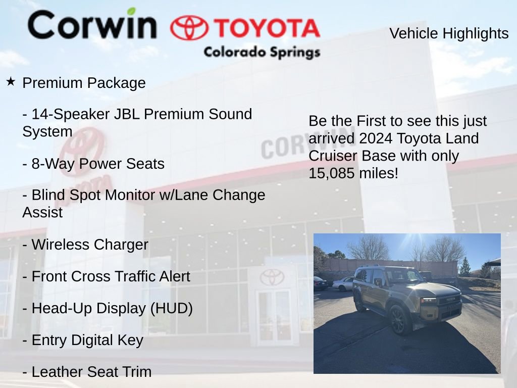 This Toyota Land Cruiser is well equipped and includes the following features and benefits, 14-Speaker JBL Premium Sound System, 18" x 7.5J Alloy Wheels, 8-Way Power Seats, ABS brakes, Alloy wheels, Blind Spot Monitor w/Lane Change Assist, Compass, Electronic Stability Control, Entry Digital Key, Front Cross Traffic Alert, Front dual zone A/C, Head-Up Display (HUD), Heated & Ventilated Front Seats, Heated door mirrors, Heated front seats, Illuminated entry, Interior Rear View Mirror, Lane Keeping System, Leather Seat Trim, Low tire pressure warning, Power Liftgate, Pre-Collision System, Premium Package, Remote keyless entry, Side Step & Step Cover, Sunroof & Moonroof, Traction control, Wireless Charger. Odometer is 657 miles below market average!
