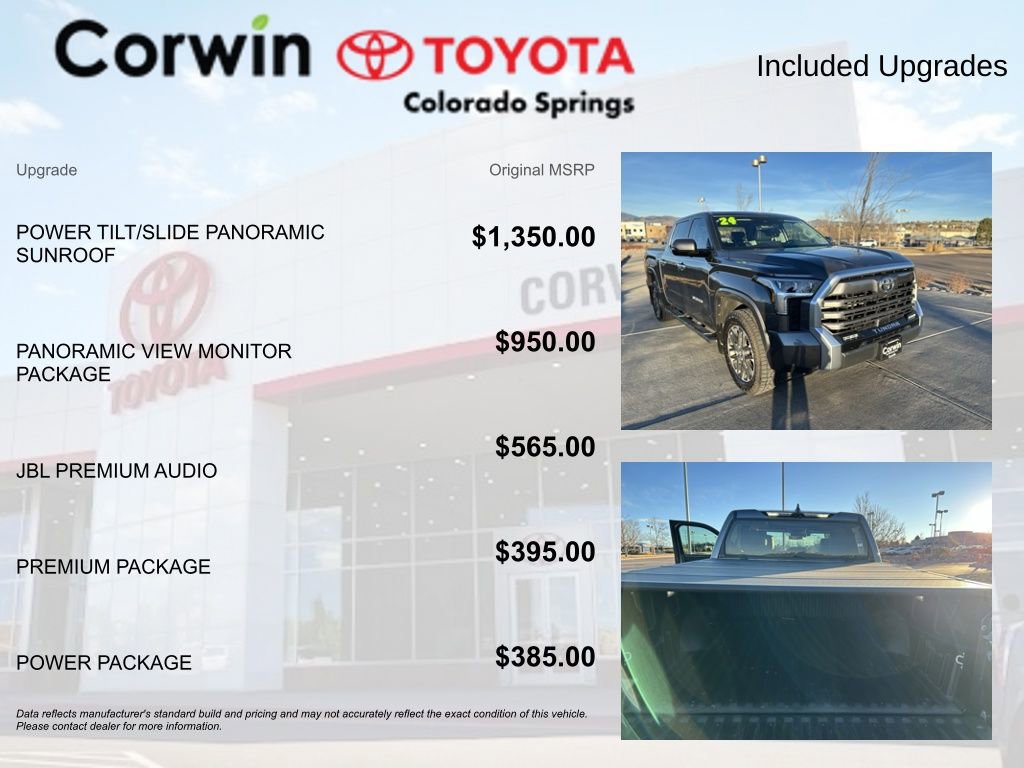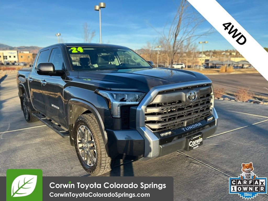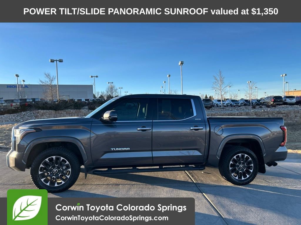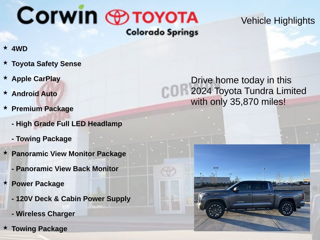 Outfitted with an array of premium features, this Tundra Limited is a true standout. Enjoy the convenience of - 4WD, Toyota Safety Sense, Apple CarPlay, and Android Auto. The vehicle also boasts a - Power Tilt/Slide Panoramic Sunroof, Panoramic View Monitor Package, JBL Premium Audio, and a Power Package that includes a 120V Deck & Cabin Power Supply and Wireless Charger. The High Grade Full LED Headlamps and Heated Leather Steering Wheel add an extra touch of sophistication.