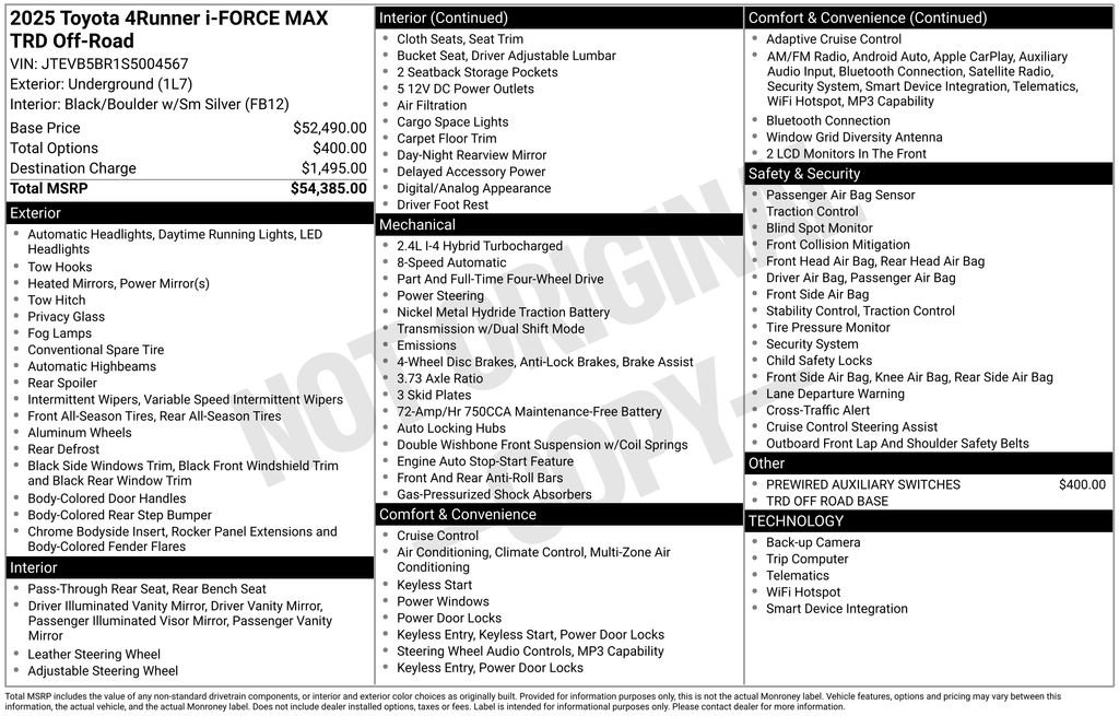This Toyota 4Runner i-FORCE MAX Hybrid is well equipped and includes the following features and benefits, 4WD, Toyota Safety Sense, Apple CarPlay, Android Auto, Backup Camera, Collision Avoidance System, Keyless Access with Push Button Start, Low Miles, Steering Wheel Mounted Controls, Super Clean, Active Parking Assist, ABS brakes, Active Cruise Control, Alloy wheels, Electronic Stability Control, Front dual zone A/C, Heated door mirrors, Heated Front Bucket Seats, Illuminated entry, Low tire pressure warning, Remote keyless entry, Traction control, TRD Off Road Base.