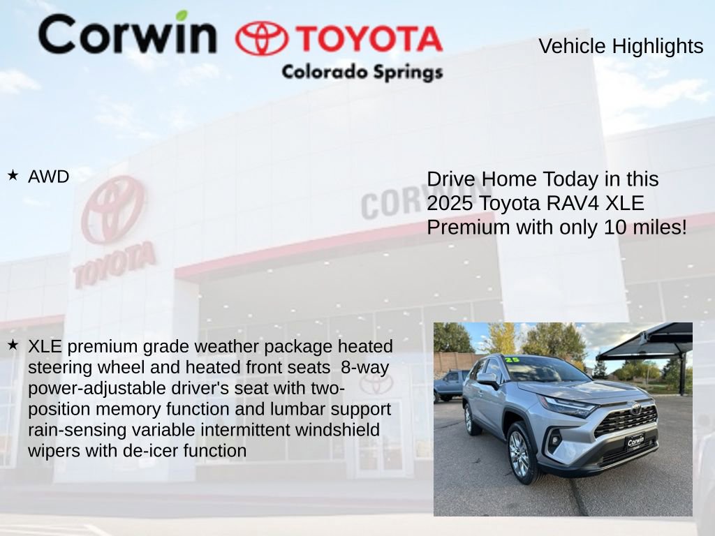 This Toyota RAV4 is well equipped and includes the following features and benefits, AWD, XLE premium grade weather package heated steering wheel and heated front seats 8-way power-adjustable driver's seat with two-position memory function and lumbar support rain-sensing variable intermittent windshield wipers with de-icer function, blackout emblem overlays molded from tough and durable black abs plastic, blackout emblem overlays are engineered to precisely fit over existing badges, making it easy to customize in minutes. designed to fit permanently over existing chrome badging for gas models, 8-in. Toyota Audio Multimedia w/ 6-Speakers, Wireless Apple CarPlay & Android Auto Compatibility SiriusXM w/ 3-Month Trial 5 USB Ports Dual Zone Auto A/C w/ Rear Air Vents SofTex-Trimmed Seats Power Driver's Seat Smart Key System w/ Push Button Start For Full Product Details, Please Visit Toyota.com/RAV4 Front-door storage pockets with bottle holders Sun visors with sliding extensions and illuminated vanity mirrors Black carpet flooring with driver-side footrest Day/night rearview mirror Electric Parking Brake (EPB) with Brake Hold One 12V/120W auxiliary power outlet in front instrument panel storage tray and one 12V/120W auxiliary power outlet in cargo area Five USB ports USB media port in front storage tray and four additional charge ports (two in front center console and two rear seat ports on the back of center console) Power windows with auto up/down and jam protection in all positions 60/40 split reclining fold-flat rear seat with center armrest and cup holders Soft-touch dash and armrests, with stitched dash and center console accents, and anti-slip interior door grip Black anti-slip in-dash storage trays Ash Gray fabric-trimmed headliner Smart Key System on front doors and liftgate with Push Button Start, remote keyless entry system with lock, unlock, and panic functions, power liftgate and remote illuminated entry Dual zone automatic climate control system with dust and pollen filter, front center vent flow controls and rear-seat vents Digital speedometer and instrumentation with analog tachometer, coolant temperature, and fuel gauges; 7-in. digital Multi-Information Display (MID) with customizable settings, odometer, tripmeters, clock, outside temperature, rear passenger seatbelt indicators, fuel economy information, trip timer, shift-position and scheduled maintenance indicators, and warning messages Leather-trimmed shift lever with sequential mode Power door locks with shift-linked automatic lock/unlock feature Turn signal stalk with headlight controls and one-touch 3-blink lane change turn signals Leather-trimmed tilt/telescopic 3-spoke steering wheel with silver accent and controls for audio, Multi-Information Display (MID, Bluetooth® hands-free phone, voice-command, Dynamic Radar Cruise Control (DRCC), Lane Departure Alert (LDA), and Lane Trace Assist (LTA) Silver interior door handles Overhead console with maplights, sunglasses storage, Safety Connect® button and power tilt/slide moonroof controls 8-in. Toyota Audio Multimedia, six speakers, with wireless Apple CarPlay® & Android AutoTM compatible, SiriusXM® with 3-month trial. See toyota.com/audio-multimedia for details., 3 Spoke Leather Heated Steering Wheel, Driver Seat w/2-Position Memory Function, Front Seat Heating, Weather Package, XLE Premium Package. Odometer is 4394 miles below market average! 27/33 City/Highway MPG