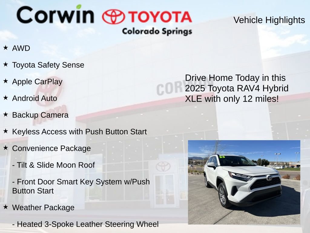 This Toyota RAV4 Hybrid is well equipped and includes the following features and benefits, AWD, Toyota Safety Sense, Apple CarPlay, Android Auto, Backup Camera, Keyless Access with Push Button Start, Convenience Package, Front Door Smart Key System w/Push Button Start, Front Seat Heating, Heated 3-Spoke Leather Steering Wheel, Tilt & Slide Moon Roof, Weather Package. Odometer is 16865 miles below market average! 41/38 City/Highway MPG