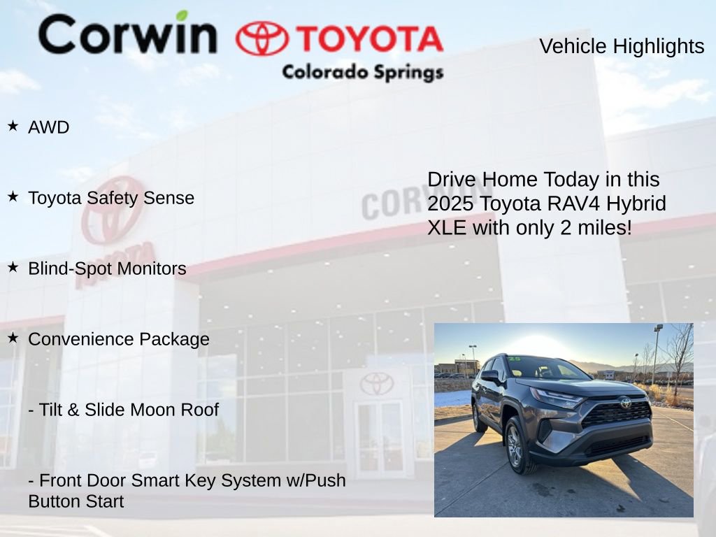 This Toyota RAV4 Hybrid is well equipped and includes the following features and benefits, AWD, Toyota Safety Sense, Blind-Spot Monitors, Convenience Package, Front Door Smart Key System w/Push Button Start, Tilt & Slide Moon Roof. Odometer is 17209 miles below market average! 41/38 City/Highway MPG