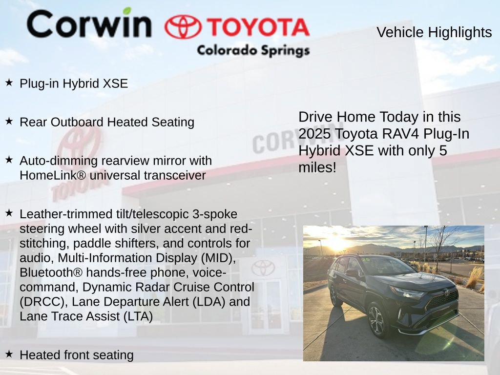 This Toyota RAV4 Plug-In Hybrid is well equipped and includes the following features and benefits, Plug-in Hybrid XSE, Rear Outboard Heated Seating, Auto-dimming rearview mirror with HomeLink® universal transceiver, Leather-trimmed tilt/telescopic 3-spoke steering wheel with silver accent and red-stitching, paddle shifters, and controls for audio, Multi-Information Display (MID), Bluetooth® hands-free phone, voice-command, Dynamic Radar Cruise Control (DRCC), Lane Departure Alert (LDA) and Lane Trace Assist (LTA), Heated front seating, SofTex®-trimmed seats with sporty red stitching and fabric seat inserts; heated front seats; 8-way power-adjustable front driver's seat with lumbar support and seatback pocket; 4-way adjustable front passenger seat with seatback pocket, 11-speaker JBL® Premium Audio including subwoofer and amplifier, 3-Spoke Heated Leather Steering Wheel, Rain Sensing Wipers, Weather Package.