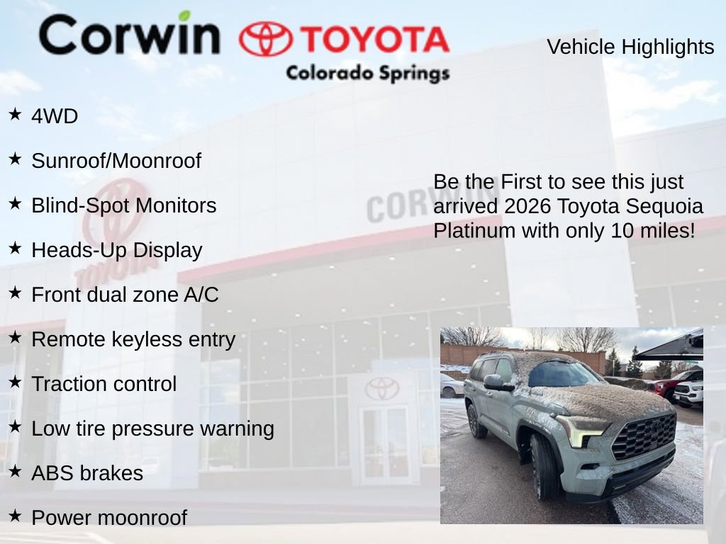 This Toyota Sequoia is well equipped and includes the following features and benefits, 4WD, Sunroof/Moonroof, Blind-Spot Monitors, Heads-Up Display, ABS brakes, Active Cruise Control, Alloy wheels, Compass, Electronic Stability Control, Front dual zone A/C, Heated door mirrors, Heated front seats, Heated rear seats, Illuminated entry, Low tire pressure warning, Power Liftgate, Power moonroof, Premium Leather Seat Trim, Remote keyless entry, Traction control.