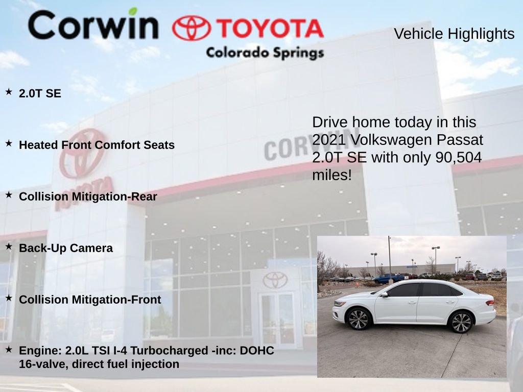 This Volkswagen Passat is well equipped and includes the following features and benefits, 2.0T SE, Heated Front Comfort Seats, Collision Mitigation-Rear, Back-Up Camera, Collision Mitigation-Front, Engine: 2.0L TSI I-4 Turbocharged -inc: DOHC 16-valve, direct fuel injection. 24/36 City/Highway MPG