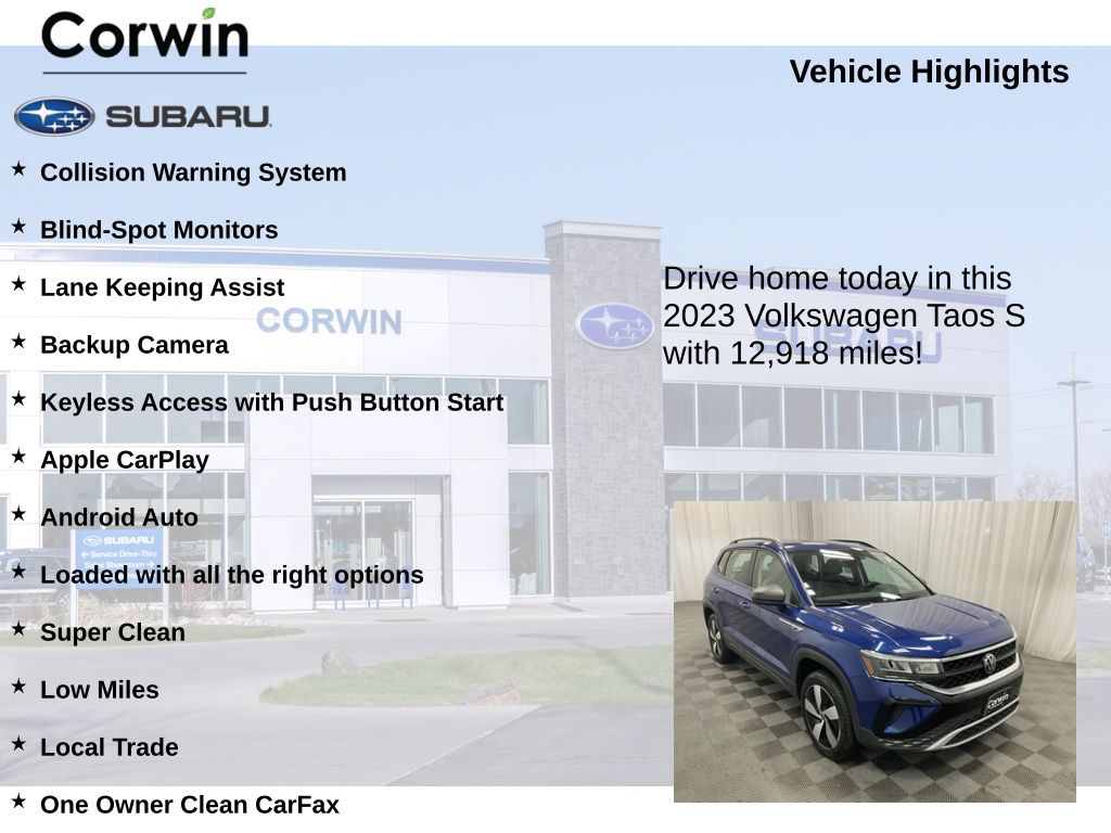 Discover the exceptional 2023 Volkswagen Taos 1.5T S, a compact SUV that seamlessly blends style, performance, and advanced technology. This meticulously maintained, one-owner vehicle with a clean CARFAX report is the perfect choice for those seeking a dynamic and versatile driving experience.