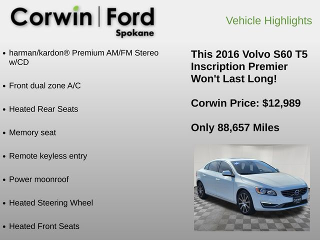 Of course, Volvo is known for safety, and the S60 T5 Inscription is a great safety pick, with low-speed forward collision warning and mitigation, whiplash protection, airbags, and home-safe lighting, to name a few. This is a compelling package of Swedish craftsmanship, safety, performance, and unmatched comfort. You've got to experience the Inscription for yourself! Save this Page and Call for Availability. We Know You Will Enjoy Your Corwin Ford Spokane Test Drive Towards Ownership! See us today at Corwin Ford Spokane. Family owned for over 100 years! Excellent selection of New and Used vehicles, Financing options. Serving Spokane, Pasco, Kennewick, Richland, Walla Walla, Hermiston, Umatilla, Yakima, Sunnyside, Grandview, Dayton, Prescott, Denton County, Franklin County, Yakima County, Spokane County, Adams County, Grant County, and the Greater Columbia Basin. *All Prices plus applicable sales tax, license, and a negotiable documentary service fee up to $200 may be added to sales price or capitalized cost of the vehicle. One vehicle unless otherwise noted and subject to prior sale without notice. While supplies last. EPA mileage estimates are for newly manufactured vehicles only. Your actual mileage will vary depending on how you drive and maintain your vehicle.